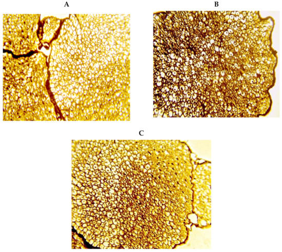 In addition, another section from the sciatic nerve was stained with silver stain to assess the morphology and integrity of the axons and myelin sheaths of sciatic nerve sections; silver staining was performed as previously described [23]. Briefly, sciatic nerve sections were deparaffinized and rinsed in distilled water three times for 5 min each. The sections were impregnated in 10% AgNO3 at 37 °C in the dark twice, the first time for 30 min and the second time after washing and adding concentrated ammonium hydroxide for 15 min.