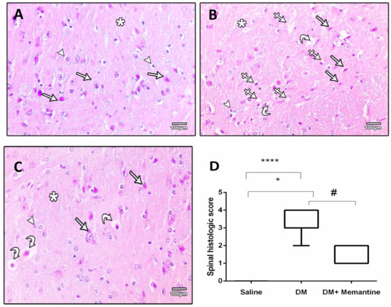 Microscopic pictures of hematoxylin and eosin stained cross sections of spinal cord. (A) Saline group showing normal neural cells (arrows) and glia cells (arrow heads) surrounded by neuropils (star). (B) Diabetic group (DM) showing marked neural cell degeneration (arrows), vacuoles in the neuropils (crossed arrow), dilated capillaries (curved arrows), and gliosis (arrow head). (C) DM+memantine group showing preserved neural cells (arrows) and glial cells (arrow head) with reduced vacuolation in the neuropil (curved arrows). ×100; bar 100 µm. (D) box-plot demonstrating the medians of the histopathologic scores assigned for the spinal cord specimens. Analysis was done using Kruskal–Wallis ANOVA. * p < 0.05, and **** p < 0.0001 versus the saline group; # p < 0.05 versus the DM group.
