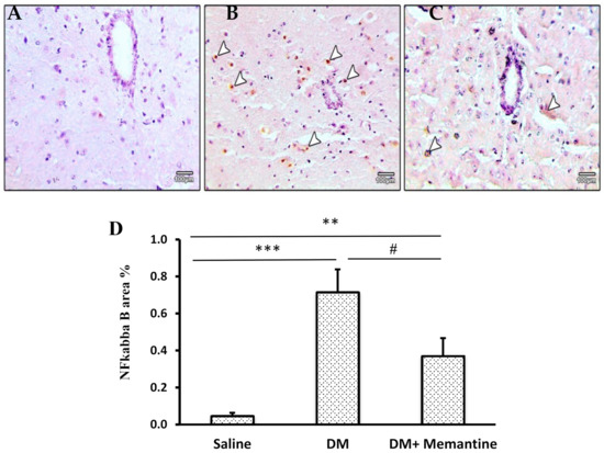 Microscopic pictures of NF-kB immunostained sections from the spinal cords. Images show cross sections with: (A) very mild staining in the saline group, (B) strong positive nuclear expression in neural cells (arrow heads) from the diabetic group, and (C) decreased positive nuclear expression in neural cells (arrow heads) from the DM+memantine group. Immunohistochemistry counterstained with Mayer’s hematoxylin. ×100; bar 100 μm. (D) Data are mean staining area ± SDM. DM: diabetes mellitus, SDM: standard deviation of the mean, and NF-kB: nuclear factor-kappa B. ** p < 0.01, and *** p < 0.001 versus the saline group; # p < 0.05 versus the DM group.