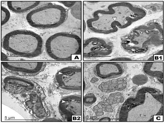 Transmission electron microscopy images of sections of the spinal cord. Images in groups; control, diabetic, and treated diabetic group. Panel (A): control section showing the normal characteristics of myelinated axons with regular myelin sheathes (arrows). Panel (B1,B2) diabetic sections showing degenerated myelinated axons (head arrows) and phagocytic microglia/macrophage cells (M) with degenerating myelin and phagocytosed matter in the cytoplasm in the white matter. The degenerated axons showing disorganized myelin sheathes with swollen vacuolated axoplasm. Microglia are surrounding the degenerated axon of a collapsed myelin sheath. Panel (C) Treated group showing myelinated axons with regular myelin sheathes, and very small unmyelinated axons were found with thickened Schwan cell basement membranes (arrows).