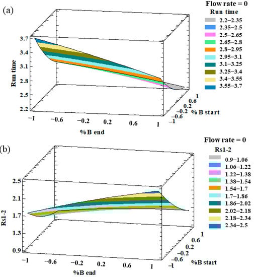 3D surface plots of the Box–Behnken design to represent the influence of (a) %B at the end of the gradient–%B at the beginning of the gradient on the run time; (b) %B at the end of the gradient–%B at the beginning of the gradient on the resolution of peaks 1 and 2 (RS1–2).