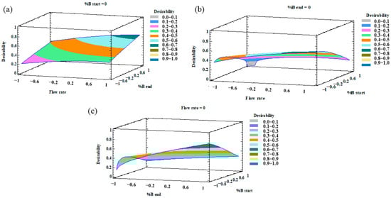 Once the MRO had been performed, the desirability was plotted as a 3D contour plot that illustrates the result of the optimization of all the variables. The combined effects of %B at the beginning–%B at the end, %B at the start-flow rate, and %B at the end-flow rate are represented in Figure 3.