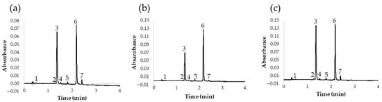 Finally, the optimum gradient of the UHPLC-PDA method developed in this study was as follows: 0.0 min, 9.9% B; 5.0 min, 53.2% B; 5.10 min, 100% B; 7.0 min, 100% B; 7.5 min, 9.9% B; 10 min, 9.9% B. The column temperature was maintained at 55 °C and the flow rate was 0.6 mL min−1. The total analysis time (sample-to-sample) was 10.0 min, including the return to the initial conditions and the re-equilibration of the column, while the separation of the seven major compounds was completed in less than 2.7 min. A representative chromatogram employing PDA (λ = 360 nm) is presented in Figure 4.