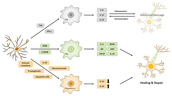 M2 activation of microglia is triggered by the cyclic AMP response element binding protein (CREB) and the C/EBP transcription factor, which not only induces the secretion of IL-4, IL-10, TGF- and neuroprotective factors, but also stimulates the initiation of chronic inflammatory processes (tissue repair) that inhibit pro-inflammatory responses [32,33]