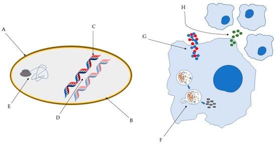 Some of the bacterial molecular targets of AMP: (A) bacterial cell wall; (B) bacterial membrane; (C) DNA synthesis; (D) DNA replication; (E) key bacterial protein synthesis. Some of the effects of AMP on host immune cells: (F) induction of autophagy on infected cells; (G) Overexpression of pro- and anti-inflammatory cytokines; (H) Chemotaxis’ induction [45,46].