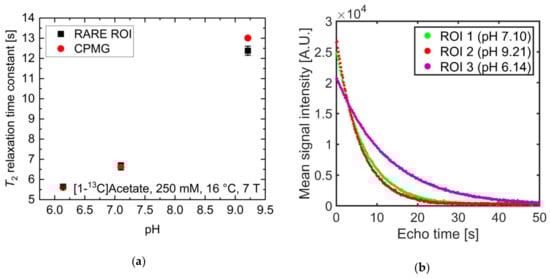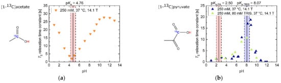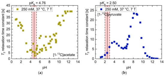 Figure 1a,b and Table 1 indicate that [1-13C]acetate and [1-13C]pyruvate showed a strong linear pH dependence of T2 in the physiological pH range (pH 6.8–7.8) [,,]. Therefore, both molecules were considered as potential candidates for in vivo pH imaging via T2 mapping with hyperpolarization techniques for signal enhancement.