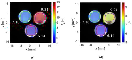 By fitting the titration curve in Figure 2a with a linear relationship in the range pH 6.14–9.21 (15 data points), calibration curves between pH and T2 can be determined, allowing pH maps to be calculated from T2 maps (Figure 4d). The derived T2 values from the CPMG measurements (Figure 4a) cannot be perfectly represented with a linear relationship; therefore, pH maps show systematic uncertainty of up to 1.6 pH units (green encircled ROI: mean pH = 5.87 ± 0.06, true pH = 7.10; red encircled ROI: mean pH = 5.56 ± 0.01, true pH = 6.14; magenta encircled ROI: mean pH = 7.62 ± 0.07, true pH = 9.21). However, tubes of different pH remain well-distinguishable, with a calculated pH heterogeneity of less than 0.1 pH unit within each tube. To further evaluate the ability to translate this pH mapping method for in vivo applications, T2 of hyperpolarized [1-13C]pyruvate was measured at 25 mM at 1 T and thermal [1-13C]pyruvate was measured at 600 mM at 7 T in human blood (Appendix B). Despite some indication for larger T2 values at more acidic blood pH, no robust calibration curve could be obtained.