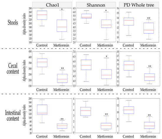Comparison of alpha diversity indices between metformin (n = 20) and control (n = 18) treatment groups in stool, cecal, and intestinal content (Student’s t-test; * p ≤ 0.002; ** p ≤ 0.001).