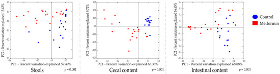 Beta diversity analysis of the three types of digestive samples clearly showed that the metformin and control treatment groups clustered separately at each digestive site (Figure 2 and Figure S2). Weighted UniFrac distances showed that the total diversity values of the two principal coordinates were 74.91%, 75.05%, and 85.53% for stool, cecal, and intestinal content, respectively.