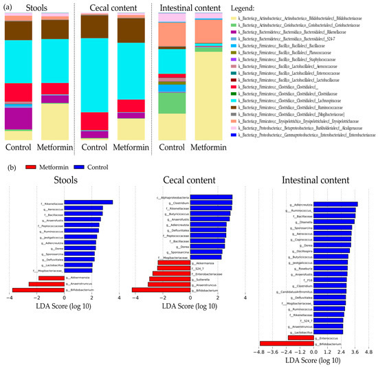 (a) Taxonomic distribution of the digestive microbiota in mice infected with Helicobacter pylori at the family level. (b) Histogram obtained using linear discriminant analysis (LDA) effect size analysis (LEfSe) to identify differentially abundant taxa in fecal, cecal, and intestinal samples. Genera and families with LDA scores >2 were identified as significantly more abundant between the metformin and control groups (p < 0.01).