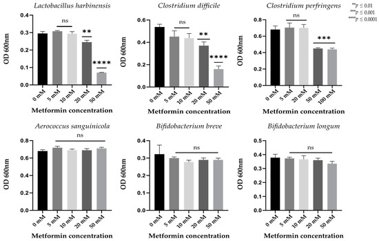 Growth of different bacterial strains at different metformin concentrations after 24 h of anaerobic incubation. Ns, non-significant. ** p < 0.01; *** p < 0.001; **** p < 0.0001 (Student’s t-test; n = 3).