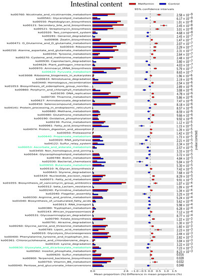 Functional analysis of the gut microbiota was performed using the Phylogenetic Investigation of Communities by Reconstruction of Unobserved States (PICRUSt) software based on closed-reference selection of operational taxonomic units (OTUs). We examined 159 pathways based on the Kyoto Encyclopedia of Genes and Genomes (KEGG) reference database. Only KEGG pathways with a relative abundance > 0.001% were considered; these represented 124, 119, and 132 KEGG pathways in stool, cecal, and intestinal samples, respectively. Pathways with a significantly different abundance between the metformin and control groups were identified for all three different digestive sites (p < 0.05, after Bonferroni correction). These differentially enriched KEGG pathways are shown in Figure 5 and Figure S3.
