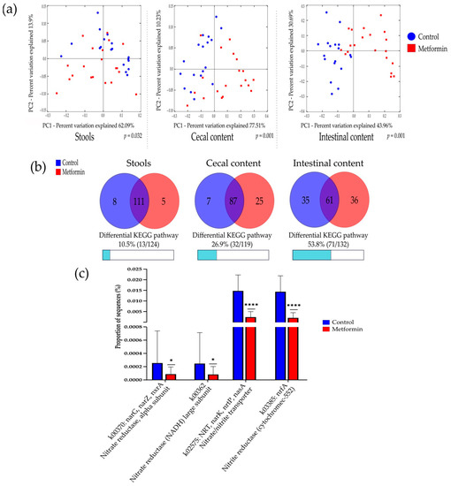 Potential functional pathways in the gut microbiota of metformin and control group mice. (a) PCoA plot comparing the microbiota of the metformin and control groups based on potential functional pathways identified using Bray–Curtis distances. Adonis statistical tests showed significant differences between the two groups (999 permutations, R2 = 0.103, 0.318, and 0.310 for stool, cecal, and intestinal content, respectively, p = 0.032 for stool, p = 0.001 for cecal and intestinal content). (b) Characteristics of differential KEGG pathway numbers in stool, cecal, and intestinal content. Red and blue circles indicate the numbers of KEGG pathways predicted to be relatively overexpressed in the metformin and control group, respectively. (c) Proportion of sequences of specific genes coding for nitrate reductase and nitrite reductase enzyme in the intestinal microbiota for the metformin (n = 20) and control (n = 18) groups. * p < 0.05; **** p < 0.0001; Mann–Whitney U test.