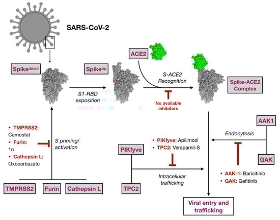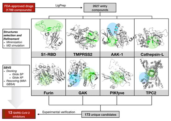 A hierarchical virtual screening (VS) approach was applied on crucial SARS-CoV-2 protein targets in the attempt to find repurposable agents from the original list of FDA approved drugs. Among all the proposed druggable targets for SARS-CoV-2, eight proteins responsible for virus entry and trafficking were selected in this study. A schematic representation of their role in virus entry and trafficking is displayed in Figure 1.