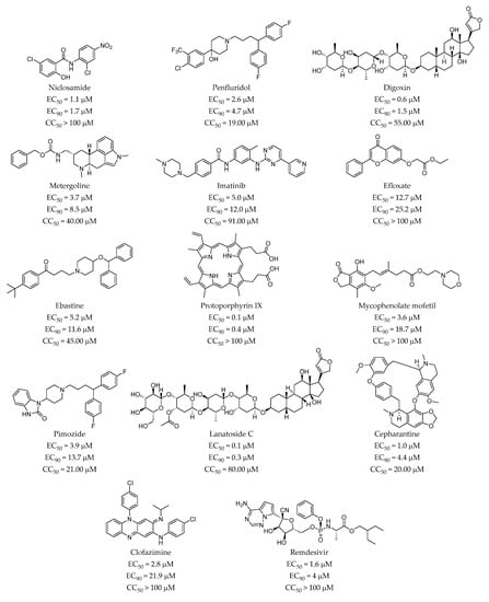 Although in principle not very innovative, drug repurposing is a promising approach to accelerate the drug discovery process, which allows for an increase of the productivity of the pharmaceutical companies [], and fills the gap existing in unmet diseases such as rare or infectious diseases [,]. In viral infections lacking effective treatment, drug repurposing combined with drug validation in animal models has enhanced the number of potential antivirals with known mechanism of action [].