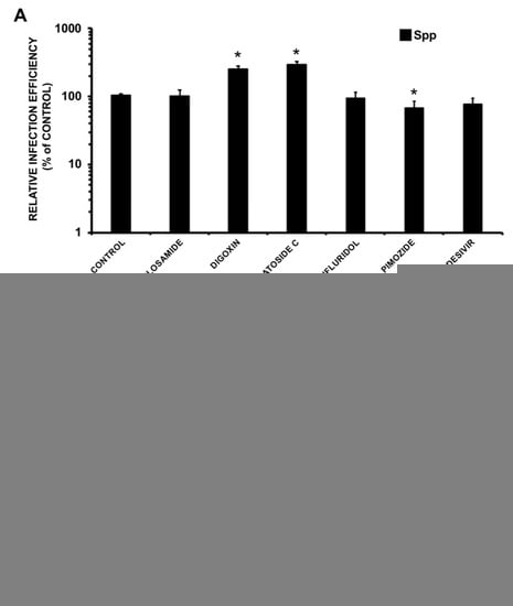 Consistent with our results, digoxin has been recently shown to interfere with viral replication at post-entry stages []. Also, lanatoside C has previously been shown to display antiviral activity against different RNA viruses at post-entry steps []. Finally, niclosamide displays antiviral activity against a broad range of viruses, including SARS-CoV [] and it has been proposed that it could interfere with viral entry by preventing endosomal acidification. We failed to show this effect since we tested the compound at doses devoid of any alteration of the MTT values.