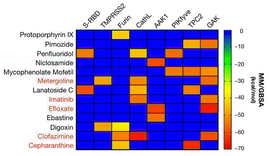 Heat matrix showing the potential targets for the 13 confirmed positive FDA compounds from Table S4 based on their MM/GBSA scores. The five finally identified as entry inhibitors are highlighted in red.