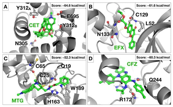 Binding modes and relative MMGBSA scores for (A) cepharantine (CET) in complex with TPC2, (B) efloxate (EFX) in complex with AAK1, (C) metergoline (MTG) in complex with cathepsin L and (D) clofazimine (CFZ) in complex with GAK.