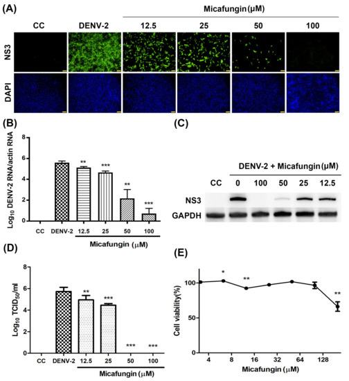 Anti-dengue virus serotype 2 (DENV-2) activity and cytotoxicity of micafungin in Vero cells: (A) DENV NS3 antibodies (upper) determined DENV-2 infection and DAPI (below) determined the nuclear by IFA; (B) RT-qPCR assay results of DENV-2 RNA; (C) Protein expression of dengue NS3 and GAPDH, as detected by Western blot analysis; (D) TCID50 assay results of DENV-2 yield; (E) Cytotoxicity of micafungin following treatment for a period of 3 days, as measured using cell viability assay. All data were obtained from at least three independent experiments, where significance was indicated as follows: * p < 0.05; ** p < 0.01; *** p < 0.001. Scale bar: 100 μM.