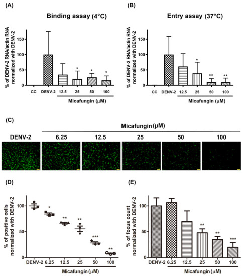 (A) Binding assay of micafungin; (B) entry assay of micafungin. RT-qPCR was used to quantify the amount of virus binding and entry. Each group was normalized with actin RNA expression and further compared to the DENV-2 group. (C) Virucidal assays of micafungin. IFA was used to estimate the infectious ability of DENV-2. Infection rate was determined using (D) ImageJ software and (E) foci counting. Data was normalized with the DENV-2 group to obtain the percentage of infection. All data were obtained from at least three independent experiments, where significance was indicated as follows: * p < 0.05; ** p < 0.01; *** p < 0.001. Scale bar: 100 μM.