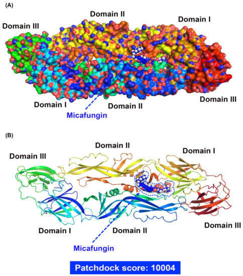 Docking simulations were performed using PatchDock to predict the molecular docking between ligands and the DENV-2 envelope glycoprotein (PDB: 1OAN) [26]. The DENV-2 envelope protein structure was selected as the receptor molecule for docking. For ligand molecule, the chemical structures of micafungin, anidulafungin, and caspofungin were obtained from spiderchem, and the file format was transformed into PDB file using Pymol (PyMOL Molecular Graphics System, Version 2.4.1, Schrödinger, and LLC). Then, the molecular docking was performed on the PatchDock, which was a geometry-based molecular docking algorithm [27]. The type of protein-small ligand was selected for computing the docking program, and the outcome presented the top 20 solutions ranked by the geometry score. Finally, the optimal docking conformation was selected according to the highest dock score [27,28].