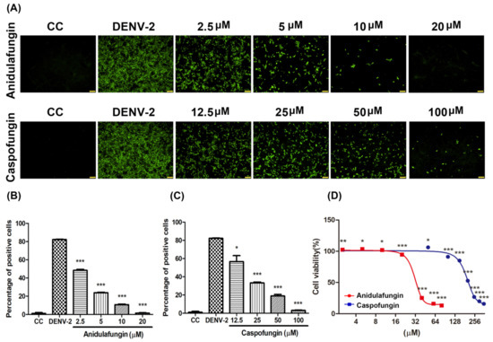 Anti-DENV-2 activity of anidulafungin and caspofungin, as determined using (A) IFA; (B,C) and ImageJ software. (D) Cell viability of anidulafungin and caspofungin. All data were obtained from at least three independent experiments, where significance was indicated as follows: * p < 0.05; ** p < 0.01; *** p < 0.001. Scale bar: 100 μM.