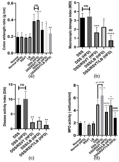 Effect of rosuvastatin (RSVT), Lactobacillus (LB), and their combined therapy on (a), colon weight/length ratio; (b), macroscopic damage index (MDI); (c), disease activity index (DAI); (d), myeloperoxidase (MPO) activity. +, p < 0.05 vs Normal (HFD); +++, p < 0.001 vs. Normal (HFD); ++++, p < 0.0001 vs. Normal (HFD); *, p < 0.05 vs DSS (HFD); **, p < 0.01 vs. DSS (HFD); ***, p < 0.001 vs. DSS (HFD); ****, p < 0.0001 vs DSS (HFD); ##, p < 0.01 vs. DSS/LB (HFD); ###, p < 0.001 vs. DSS/LB (HFD); ns, non-significant.