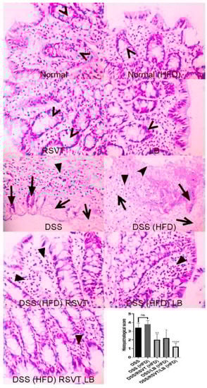 Photomicrographs of colon specimens from Normal, Normal (HFD), RSVT, and LB rat groups displaying normal colonic mucosa and crypts (open arrowheads). Colon specimens from DSS and DSS (HFD) rat groups display de-epithelialization (notched arrowhead), loss of crypts (filled arrows), degenerated tissue (open arrows) and inflammatory cell infiltration (filled arrowhead). Colon specimens from DSS/RSVT (HFD) and DSS/LB (HFD) display moderate crypt degeneration and inflammatory cell infiltration (filled arrowhead). Colon specimens from DSS/RSVT/LB (HFD) display marked decrease in crypt degeneration and inflammatory cell infiltration (filled arrowhead). In addition, DSS/RSVT (HFD), DSS/LB (HFD) and DSS/RSVT/LB (HFD) groups of rats showed a significant decrease in the microscopic evaluation score (p < 0.01, p < 0.05, p < 0.0001, respectively) compared with DSS (HFD) rats. H&E, ×400. *, p < 0.05 vs. DSS (HFD); **, p < 0.01 vs. DSS (HFD); ****, p < 0.0001 vs DSS (HFD); ns, non-significant.