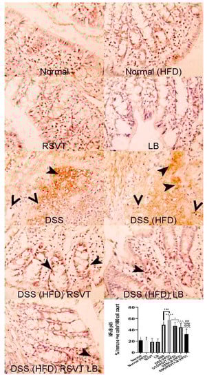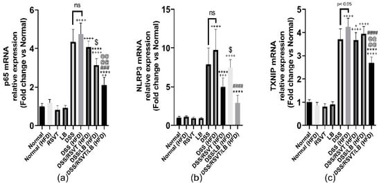 By contrast, compared with the DSS (HFD) group, the DSS/LB (HFD) and DSS/RSVT/LB (HFD) groups showed a significant decrease in NF-κB p65 mRNA expression levels. However, the DSS/RSVT (HFD) group did not show a significant change in the level of NF-κB p65 mRNA expression. The DSS/LB (HFD) treatment group exhibited a significant downregulation in NF-κB p65 expression compared with the DSS/RSVT (HFD) treatment group (p < 0.05). The DSS/RSVT/LB (HFD) group showed a significant downregulation in NF-κB p65 mRNA expression compared with both the DSS/LB (HFD) and DSS/RSVT (HFD) groups (p < 0.05) (Figure 7b). The DSS/RSVT (HFD) and DSS/RSVT/LB (HFD) groups showed a significant decrease in TXNIP mRNA expression compared with the DSS/HFD group. However, compared with the DSS (HFD) group, the DSS/LB (HFD) group did not show a significant change in the level of TXNIP expression. Finally, the DSS/RSVT/LB (HFD) group showed a significant downregulation of TXNIP mRNA gene compared with both the DSS/RSVT (HFD) and DSS/LB (HFD) groups (p < 0.05) (Figure 7c).