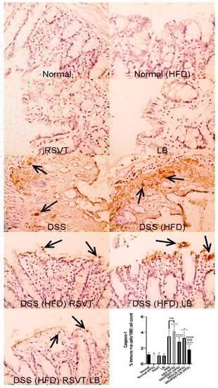 Photomicrographs of colon specimens showing caspase-1 immunoexpression. Normal, Normal (HFD), RSVT, and LB groups display normal caspase-1 immunoexpression. The DSS and DSS (HFD) groups display increased immunoexpression (open arrows). DSS/RSVT (HFD), DSS/LB (HFD) and DSS/RSVT/LB (HFD) rat groups showing a significant decrease in caspase-1immunoexpressiom compared with DSS/HFD. IHC, ×400. +++, p < 0.001 vs. Normal (HFD); ++++, p < 0.0001 vs. Normal (HFD); *, p < 0.05 vs. DSS (HFD); ****, p < 0.0001 vs. DSS (HFD); ####, p < 0.0001 vs. DSS/LB (HFD); @@, p < 0.01 vs. DSS/RSVT (HFD); ns, non-significant.