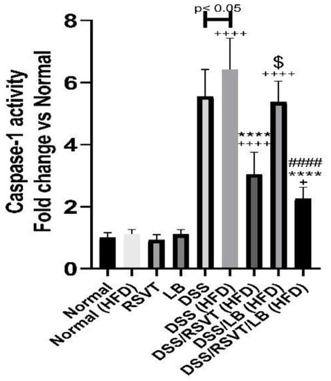 As shown in Figure 5, the DSS (HFD) rat group showed a significant increase in caspase-1 activity compared with the Normal (HFD) (p < 0.0001) and DSS (p < 0.05) groups. Rats from the DSS/RSVT (HFD) and DSS/RSVT/LB (HFD) groups exhibited a significant counterbalance in increased caspase-1 activity induced by DSS relative to HFD feeding (p < 0.0001). However, compared with that in the DSS (HFD) group, caspase-1 activity did not differ significantly in the DSS/LB (HFD) group. The DSS/RSVT (HFD) group exhibited a significant decrease in caspase-1 activity compared with the DSS/LB (HFD) group (p < 0.05). Additionally, the DSS/RSVT/LB (HFD) group showed a significant decrease in caspase-1 activity compared with the DSS/LB (HFD) group (p < 0.0001).