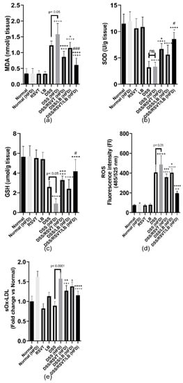 The DSS (HFD) group displayed a significant increase in colonic MDA content, reaching 4.63-fold relative to that of the HFD control group (p < 0.0001). Furthermore, compared with that in the DSS (HFD) rat group (p < 0.05), the MDA content was significantly decreased in the DSS/RSVT (HFD), DSS/LB (HFD), and DSS/RSVT/LB (HFD) groups. DSS-induced oxidative stress in the rat colons was evaluated by measuring SOD and GSH levels. As shown in Figure 6b,c, the DSS (HFD) group showed a significant reduction in the levels of SOD and GSH by approximately 72.26% and 83.9%, respectively, compared with the Normal (HFD) control group (p < 0.0001). Additionally, in comparison with the DSS (HFD) rat group, SOD and GSH levels were significantly increased in the DSS/RSVT (HFD) and DSS/RSVT/LB (HFD) groups. However, the DSS/RSVT/LB (HFD) group exhibited a significant increase in both SOD and GSH than did DSS/LB (HFD) group (p < 0.05). SOD and GSH levels did not differ significantly in the DSS/LB (HFD) group than in the DSS (HFD) group. Consistent with the SOD and GSH results, we observed that ROS FI was significantly increased in the DSS (HFD) group than in the Normal (HFD) group. Furthermore, treatment of the DSS (HFD) rats with RSVT, LB, and a combination of both significantly repressed the ROS-induced increase. Moreover, the DSS (HFD) rat group showed a significant increase in ROS compared with that of the DSS group (Figure 6d). Our results also revealed a significant increase in sOx-LDL in the DSS (HFD) group than in the DSS rats and an insignificant change compared with that of the Normal (HFD) group. However, the DSS/RSVT (HFD) and DSS/RSVT/LB (HFD) groups, and not the DSS/LB (HFD) group, exhibited significantly reduced levels of sOx-LDL compared with that of the DSS (HFD) group (Figure 6e).