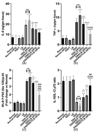 Effect of rosuvastatin (RSVT), Lactobacillus (LB), and their combined therapy on (a), IL-6; (b), tumor necrosis factor alpha (TNF-α); (c), NF-κB p-p65 (Ser 536)/p65; and (d), IL-10/IL-12 P70. ++, p < 0.01 vs. Normal (HFD); +++, p < 0.001 vs. Normal (HFD); ++++, p < 0.0001 vs. Normal (HFD); *, p < 0.05 vs. DSS (HFD); **, p < 0.01 vs. DSS (HFD); ***, p < 0.001 vs. DSS (HFD); ****, p < 0.0001 vs. DSS (HFD); ##, p < 0.01 vs. DSS/LB (HFD); ###, p < 0.001 vs. DSS/LB (HFD); @@@, p < 0.001 vs. DSS/RSVT (HFD); @@@@, p < 0.0001 vs. DSS/RSVT (HFD); ns, non-significant.