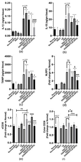Effect of rosuvastatin (RSVT), Lactobacillus (LB), and their combined therapy on (a), IL-1β; (b), IL-18; (c), TXNIP; (d), NLRP3; (e), sCD36; and (f), colon CD36. ++, p < 0.01 vs. Normal (HFD); ++++, p < 0.0001 vs. Normal (HFD); *, p < 0.05 vs. DSS (HFD); **, p < 0.01 vs. DSS (HFD); ***, p < 0.001 vs. DSS (HFD); ****, p < 0.0001 vs. DSS (HFD); #, p < 0.05 vs. DSS/LB (HFD); ###, p < 0.001 vs. DSS/LB (HFD); ####, p < 0.0001 vs. DSS/LB (HFD); @@@, p < 0.001 vs. DSS/RSVT (HFD); $, p < 0.05 DSS/RSVT (HFD) vs. DSS/LB (HFD); $$$$, p < 0.0001 DSS/RSVT (HFD) vs. DSS/LB (HFD); ns, non-significant.