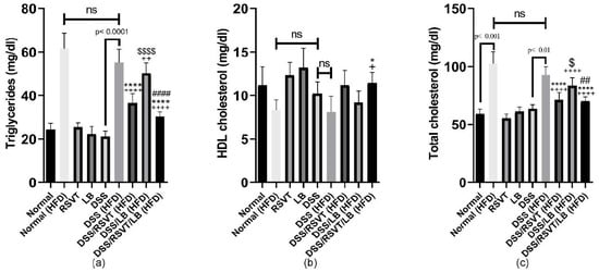 Effect of rosuvastatin (RSVT), Lactobacillus (LB), and their combined therapy on (a), triglycerides; (b), high density lipoprotein (HDL); and (c), total cholesterol. +, p < 0.05 vs. Normal (HFD); ++, p < 0.01 vs. Normal (HFD); ++++, p < 0.0001 vs. Normal (HFD); *, p < 0.05 vs. DSS (HFD); ****, p < 0.0001 vs. DSS (HFD); ##, p < 0.01 vs. DSS/LB (HFD); ####, p < 0.0001 vs. DSS/LB (HFD); $, p < 0.05 DSS/RSVT (HFD) vs. DSS/LB (HFD); $$$$, p < 0.0001 DSS/RSVT (HFD) vs. DSS/LB (HFD); ns, non-significant.