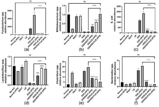 Effect of rosuvastatin (RSVT), Lactobacillus (LB), and their combined therapy on the relative abundance of different microbial species (a), Bifidobacterium spp.; (b), Lactobacillus spp.; (c), E. coli; (d), Fusobacterium spp.; (e), Clostridium spp.; and (f), Bacteroides spp. **, p < 0.01 vs. DSS (HFD); ***, p < 0.001 vs. DSS (HFD); ****, p < 0.0001 vs. DSS (HFD); ns, non-significant.