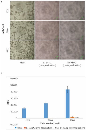 Anchorage-independent growth. HeLa cells and E1-MYC cells from pre- or post-production medium were seeded at three different densities and cultured for 7 days. (a) Representative images (4× magnification) HeLa and E1-MYC cultures after 7 days. (b) Relative cell growth as determined by DNA-binding dye fluorescence after 7 days in culture. Results represent the mean (n = 3, triplicate for each sample) ± SD.