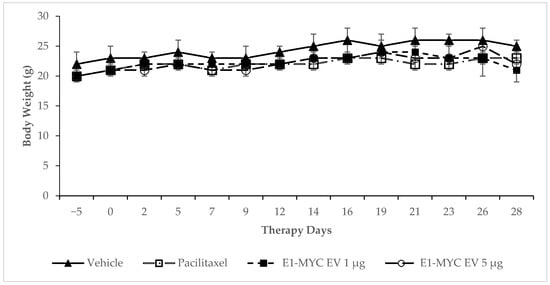 To monitor the overall well-being of the mice, body weight of the mice was measured. There was no statistically significant difference among the body weights of mice receiving vehicle, Paclitaxel, or E1-MYC exosomes (both 1 µg and 5 µg doses) (Figure 2), suggesting that MSC exosomes from E1-MYC cells did not have any adverse effect on the animals.