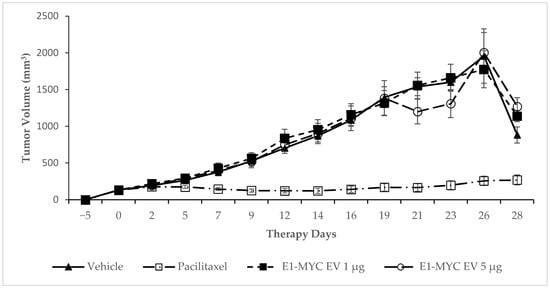 Effect of E1-MYC exosome on tumor growth. Mice were injected with either vehicle, Paclitaxel, or two different doses of E1-MYC exosome (1 µg or 5 µg), and tumor volume was recorded thrice weekly. Animals treated with E1-MYC exosome had no difference from vehicle control in terms of tumor growth. Results represent the mean ± SEM, n = 8 for all groups from day 0 to day 16. After day 16, tumor volume in some exosome- or vehicle-treated mice started to exceed 2000 mm3. Euthanizing mice with large tumor volumes reduced the average increase in tumor volume and eventually reduced the tumor volume. At day 28, the vehicle and exosome groups each had only two surviving mice.