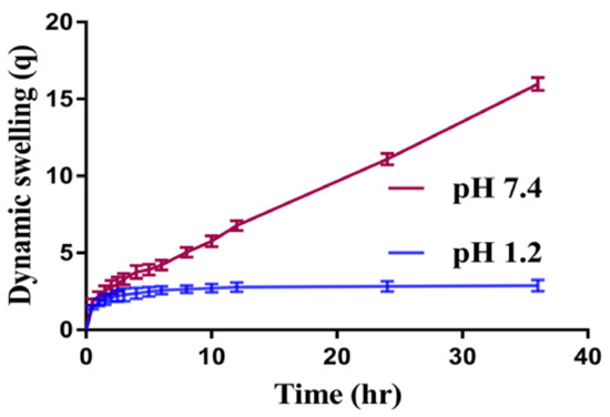 Dynamic swelling is performed to understand the swelling behavior of SPSPAA hydrogels at two different acidic and basic swelling media (pH 1.2 and pH 7.4), respectively, as shown in Figure 1. The pH value highly influences the dynamic swelling of SPSPAA as lower swelling is observed at pH 1.2 compared to pH 7.4. This behavior of hydrogels is because of the protonation of functional groups of SPS and AA at pH 1.2 and deprotonation at pH 7.4, respectively. The pKa value of SPS is −2.1 which means SPS is highly acidic by nature. Like 2-acrylamido-2-methyl propane sulphonic acid, SPS contains sulfonate groups. When SPS reacts with AA, it imparts pH-dependent behavior to the fabricated network of hydrogels. At lower pH 1.2, sulfonate ions of SPS are protonated and associated and give strength to the hydrogen bonding and thus generate a strong physical interaction among hydrogels. All these factors further generate additional strength and thus lead to a decrease in swelling at acidic medium [16]. Whereas at higher pH 7.4, sulfonate groups of SPS lead to ionization or deprotonation due to an increased charge density on the polymeric network, thus generating strong electrostatic repulsion among its ionized –SO3– groups, and higher swelling of SPSPAA hydrogels is exhibited [17]. These all lead to a decrease or loss of intermolecular hydrogen bonding, and thus, an increase in dynamic swelling is observed [18]. Similarly, at low pH 1.2, protonation of COOH groups of AA occurs, due to which the hydrogel network collapses and less swelling is exhibited. The pka of AA is about 4; hence, as the pH value of the medium increases from 6 to 8, deprotonation of COOH groups occurs, and as a result, electrostatic repulsive forces are increased among the COOH groups, and thus higher swelling is exhibited at higher pH 7.4 [19].