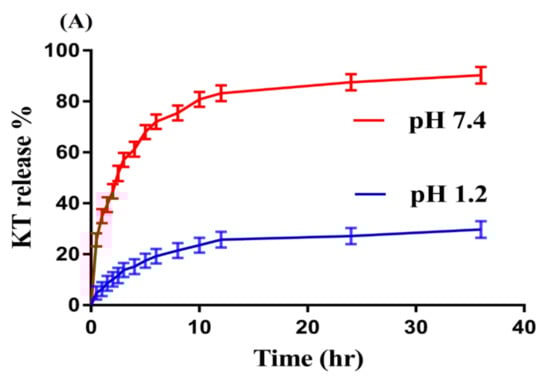 KT 1% solution was used for drug loading. Weighed, dried hydrogels were immersed in drug solution at 25 °C. Phosphate buffer 7.4 was used as solvent for dissolving KT. The immersed, fabricated hydrogels in drug solution were kept until a constant weight was achieved. The drug-loaded hydrogels were placed in a vacuum oven at 40 °C until they dried completely [42,43].