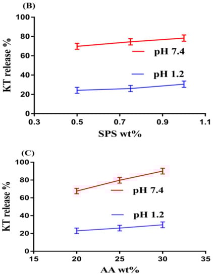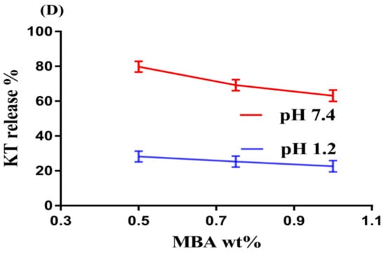 Like pH, the composition of hydrogels content also influences the release of drug from the fabricated network of hydrogels at both media, i.e., pH 1.2 and 7.4, respectively, as shown in Figure 2B–D. Increase in the percent drug release is observed as the composition of SPS increases at a constant composition of AA and MBA (Figure 2B). The increase in percent drug release is due to an increase in –SO3– groups that ionize highly as the composition of SPS increases and as a result the percent drug release is increased. Similarly, percent drug release increases as the composition of AA increases due to an increase in COOH groups (Figure 2C) [26] and vice versa. Unlike SPS and AA, a decrease in percent drug release is observed as the composition of MBA increases due to higher cross-linking and bulk density (Figure 2D) [27,28].