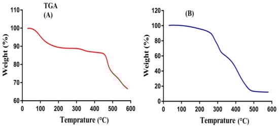 The thermal stability of pure polymer SPS and SPSPAA hydrogels is observed by conducting TGA of a sample as shown in Figure 3A,B. Initially, TGA of SPS is carried out (Figure 3A). An initial weight loss of 10% is observed at a temperature range of 50–250 °C. After that, 7% weight reduction is detected within the range of 320–420 °C. Further increase in temperature leads to degradation of the polymer that starts from 430 °C until complete paralysis [30]. Thereafter, SPSPAA hydrogel is also subjected to TGA analysis (Figure 3B) and results are compared with pure polymer. The initial weight loss of 35% of the developed hydrogel is depicted by the TGA analysis at 208–280 °C due to loss of moisture contents. Similarly, a further weight loss of 20% is observed at 360–380 °C, and finally, 17% weight loss of fabricated hydrogel is found at 385–480 °C. After that, degradation of SPSPAA hydrogels starts until entire degradation. The degradation half-life of polymer is (t1/2 = 430 °C) whereas the degradation half-life of SPSPAA hydrogels is (t1/2 = 480 °C), which indicates that the developed system is thermally more stable then unreacted pure polymer and attributed to strong cross-linking between SPS and AA. Barkat and his co-workers prepared PEG 4000-based hydrogels and found higher thermal stability of the fabricated network compared to pure polymer [31].
