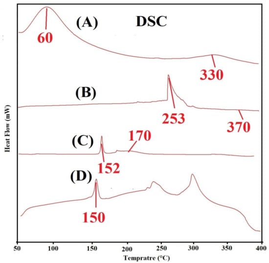 Differential Scanning Calorimetry (DSC) of (A) SPS, (B) SPSPAA hydrogel, (C) KT, and (D) loaded SPSPAA hydrogels.