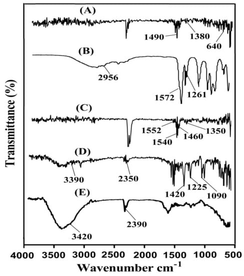 FTIR spectra are analyzed for SPS, AA, KT, unloaded SPSPAA hydrogels, and drug-loaded SPSPAA hydrogels as indicated in Figure 6A–E, correspondingly. SPS (Figure 6A) shows FTIR spectra peaks at 1380 and 1490 cm−1 indicating the symmetric and asymmetric vibration of the SO3− group respectively. A peak at 640 cm−1 indicates aromatic C-H [34]. Similarly, distinct peaks of AA (Figure 6B) is assigned to the stretching vibration of –C–C and –CH2 at 1572 and 2956 cm−1, whereas the prominent peak at 1261 cm−1 is assigned to the stretching vibration of –C=O respectively [35]. The FTIR spectra of unloaded SPSCPAA hydrogels (Figure 6C) indicate a change in position of peaks for various functional groups of SPS and AA due to electrostatic interactions between them. The prominent peaks of SPS at 1380 and 1490 cm−1 are modified to 1460 and 1540 cm−1 peaks of unloaded SPSPAA hydrogels. Similarly, characteristic peaks of AA at 1572 and 1261 cm−1 are shifted to 1552 and 1350 cm−1, respectively. The disappearance of some peaks and formation of new peaks indicate the change in the intensity of the SPS and AA peaks. The above discussion indicates the development of SPSPAA hydrogels due to the cross-linking of SPS with AA on their reactive sites. The FTIR spectrum of KT (Figure 6D) exhibits peaks at 3390 cm−1 due to the stretching vibration of N-H and NH2, while the peak at 1420 cm−1 is due to –C–N vibrations. Similarly, two peaks at 1225 and 1090 cm−1 indicate the stretching vibration of C=O (diaryl ketone) and bending of –OH, which confirms the presence of an alcoholic group. Two peaks at 2190 and 752 cm−1 confirm the bending of C–H (aromatic) [36,37,38]. As indicated in Figure 6E, the FTIR spectra of drug-loaded SPSPAA hydrogels indicate a slight change in the prominent peaks of the drug due to encapsulation of the drug by the polymeric system. The characteristic peaks of the drug at 3390 and 2350 cm−1 are modified slightly to 3420 and 2390 cm−1 in loaded SPSCPAA hydrogels. The results demonstrated that the drug is encapsulated by SPSPAA hydrogels and no interaction of the drug with the contents of the hydrogels is observed [39].