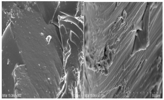 Scanning electron microscopy (SEM) is performed for the SPSPAA polymeric network to know its surface morphology. A rough surface with few pores is seen at different magnifications, as shown in Figure 7. The water penetrates through the pores into the hydrogel network, and as a result, the hydrogels swell. Drug loading depends on the swelling index of hydrogels. The higher the swelling, the greater the drug loading will be and vice versa. The rough surface of the developed hydrogels is because of good compatibility between the polymer, monomer, and cross-linker.