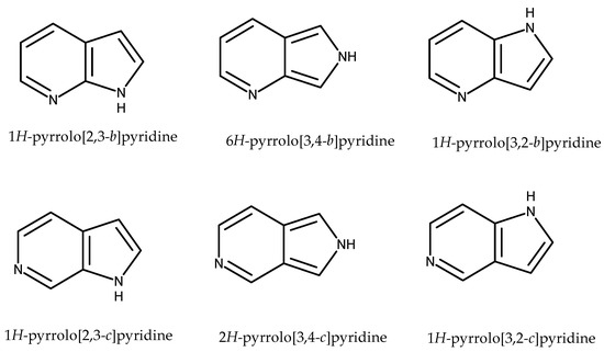 Due to their structure containing two important pharmacophores, i.e., pyrrole and pyridine, pyrrolopyridines have been the subject of many pharmacological studies over the last hundred years. Pyrrole derivatives show a wide range of pharmacological activity. Pyrroles could build the structure of porphyrin rings. Many of the drugs contain a pyrrole ring, for example, nootropic (Piracetam), anti-inflammatory (Indometacin), statins (Fluvastatin), neuroleptics (Molindone), drugs used to treat insomnia (Zopiclone), migraine (Sumatriptan), Parkinson disease (Procyclidine), and erection disorders (Tadalafil). Compounds containing a pyrrole ring found in essential oils are used as anticancer agents (5-iodotubercidin) [5] and antibacterial agents (Cefepim, Doripenem, Meropenem) [6]. Fostemsavir has recently been approved for HIV treatment. Drugs containing a pyrrolopyridine scaffold such as Vemurafenib or Pexidartinib are used in anticancer therapy [3]. Pyrrolo[3,2-c]pyridine derivatives show inhibitory effect against FMS kinase and are promising candidates for anticancer and antiarthritic drug development [7].