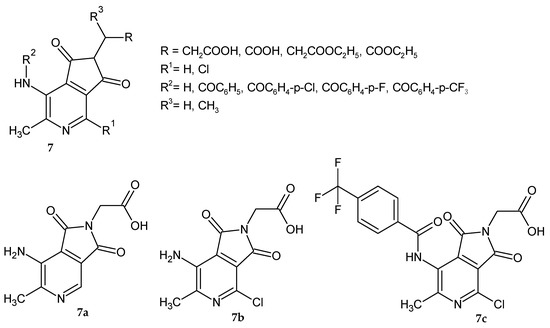 Da Settimo et al. [9] synthesized a series of 6-methylpyrrolo[3,4-c]pyridine-1,3-dione alkanoic acid derivatives 7 with potential AR inhibitory activity (Figure 4). The obtained compounds were evaluated for their ability to inhibit AR in vitro in the extract of rat lenses. The biological data showed that the acidic derivatives proved to be new AR inhibitors. The presence of the carboxylic group at an adequate distance from the pyrrolopyridine scaffold is important for their activity. Compounds with a small chain length of carboxylic acid proved to be much more potent inhibitors than propionic or iso-propionic acid derivatives. Its corresponding ethyl ester analogs were inactive even at a higher concentration range. Among amide analogs most potent was 4-trifluoromethyl-benzylamide derivative 7c, but no more active than 7a. The inhibition potency of compounds 7a–c was similar to the reference Alrestatin and Sorbinil at concentrations: 10−5 M (70–90%) and 10−6 M (33–43%). IC50 (the concentration at which a substance exerts half of its maximal inhibitory effect) values for compounds 7a–c were 1.4 µM, 2.5 µM, and 1.7 µM, respectively. The most active derivatives 7a–b were evaluated as inhibitors of glutathione lens depletion in galactosemic rats. Glutathione depletion in the lens occurs rapidly after induction of galactosemia in rats (following the galactose diet). None of the tested compounds were active in maintaining glutathione levels in the rats’ lenses, which may be due to problems with metabolism or ocular bioavailability.