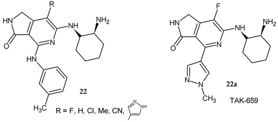 Lam et al. [24] prepared 6-[(2-aminocyclohexyl)amino]-1,2-dihydro-3H-pyrrolo[3,4-c]pyridin-3-one derivatives 22 as SYK inhibitors (Figure 17). The 4-(3-methylanilino)-substituted compounds exhibited good enzymatic and cellular potency. It turned out that the 7-fluoro substitution had a significant effect on the activity. Replacing methylaniline with a methylpyrazole ring increased the activity of the 4-fluoro derivative. The methylpyrazole derivative 22a showed the best in vitro profile and was selective for kinases (it was potent toward both SYK and FLT3). Compound 22a showed inhibition toward an SYK-dependent and FLT3-dependent cell line in a cell proliferation assay. It demonstrated strong tumor growth inhibition (TGI) after 20 days of treatment. This derivative blocked anti-IgD stimulated expression of CD86 in murine peripheral B cells in vivo. Compound 22a named TAK-659 has been used in clinical trials to treat advanced solid tumors and lymphoma malignancies [24].