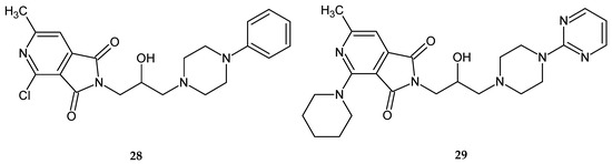 A year later, the same scientists obtained another series of compounds derived from pyrrolo[3,4-c]pyridines [30]. This time, they studied the influence of other amino- and alkyl-(aryl-)aminoalkyl(hydroxyalkyl) substituents on the activity of 3,4-pyridinedicarboximide. They synthesized fifteen differently substituted derivatives, of which only compound 27 (Figure 22) deserved attention. Only compound 27 significantly depressed locomotor activity at doses of 1/10 and 1/20 LDmin. [30].